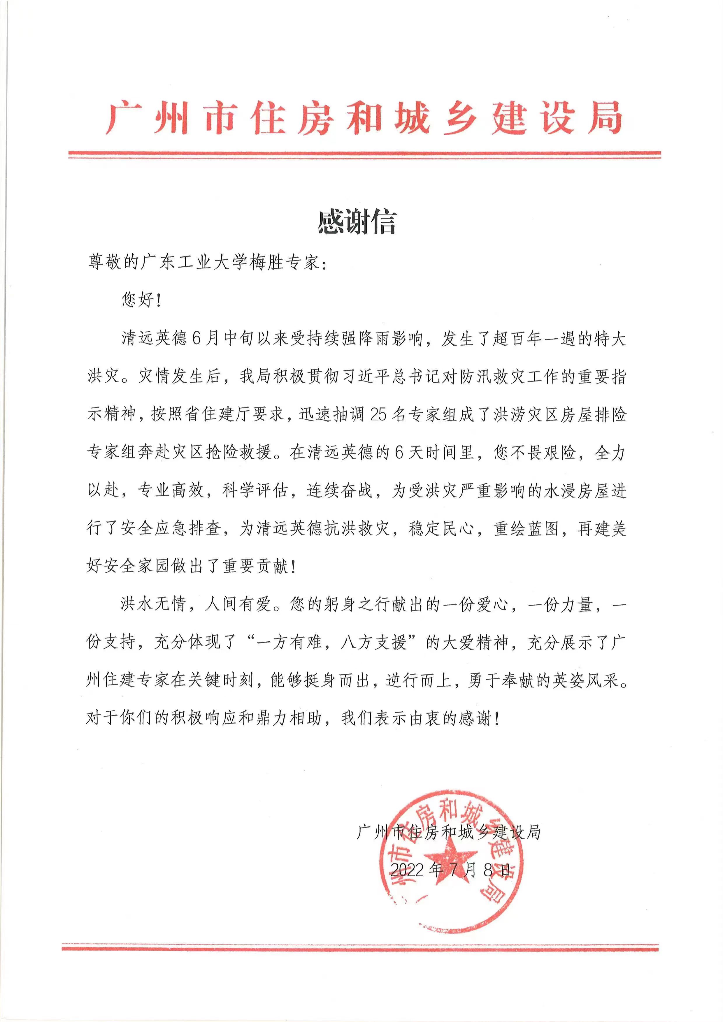 6月中旬,清远英德发生超百年一遇的特大洪灾。离退休工作党委沙河校区退休第三党支部党员梅胜同志积极参加由广州市住房和城乡建设局组成的洪涝灾区房屋排险专家组奔赴灾区抢险救灾,在6天的时间里,作为党员志愿者的他不畏艰险,全力以赴,专业高效,科学评估,连续奋战,为清远英德抗洪救灾,稳定民心,重绘蓝图,再建美好安全家园作出了重要的贡献。充分体现了“一方有难,八方支援”的大爱精神,彰显了广大离退休党员持之以恒、艰苦奋斗、服务人民、无私奉献的“硬核担当”和初心本色。