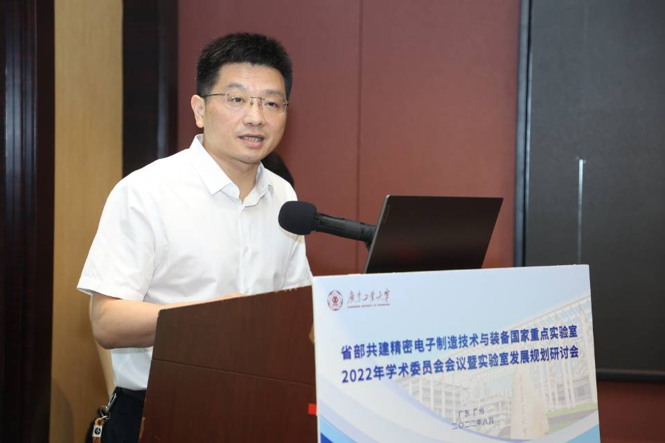 8月14日,广东工业大学省部共建精密电子制造技术与装备国家重点实验室(以下简称“国重实验室”)2022年学术委员会暨实验室发展规划研讨会在广州召开,会议采用线上线下相结合的形式进行。国重实验室学术委员会主任、华中科技大学校长尤政院士,实验室副主任、长春光机所原所长王立军院士等全体学术委员会成员,特邀专家中南大学钟掘院士、浙江大学谭建荣院士、清华大学雒建斌院士、南京航空航天大学校长单忠德院士等一批知名专家学者,还有大族激光、华为海思、广州新粤能、兴森快捷、苏州迈为等一批知名电子制造企业技术专家参加了会议。广东省科技厅实验室与平台基地处处长黄江康、学校副校长王成勇出席会议并致辞。会议由国重实验室主任陈新教授主持。