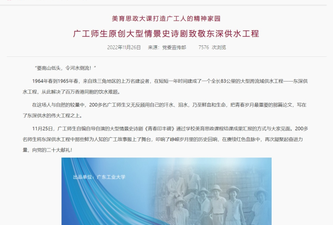 优秀深度报道类新闻作品《广工师生原创大型情景史诗剧致敬东深供水工程》
