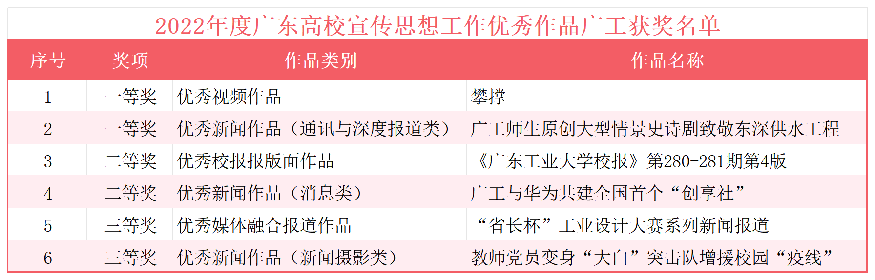 近日,广东省委教育工委公布2022年度高校宣传思想工作优秀作品评选结果,学校报送的作品获一等奖2项,二等奖2项,三等奖2项,获奖总数居全省高校第三。这也是学校在此项评选中获得的历史最好成绩。