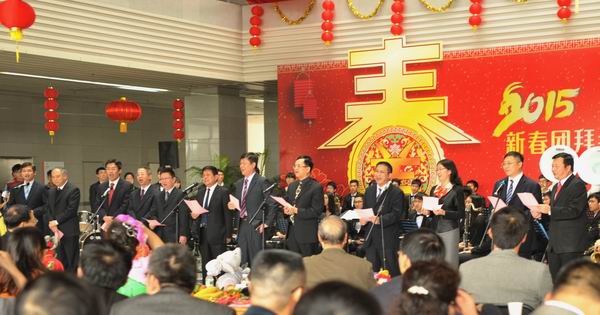 本网讯1月26日,学校在大学城校园举行2015年新春团拜会暨新年音乐会。校党委书记苏一凡、校长陈新等学校全体党政领导班子成员参加团拜活动,与师生员工共迎2015年新春的到来。