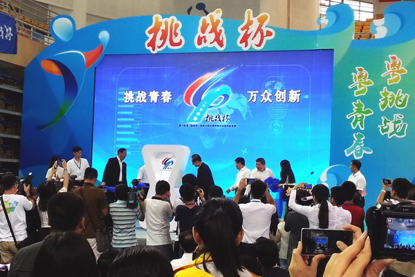 本网讯5月23日下午,第十四届“挑战杯”全国大学生课外学术科技作品竞赛在广州大学城举行第一次发布会。会上发布了第十四届“挑战杯”国赛会徽、口号、官方微信,播放了宣传片。全国政协副主席、中国科协主席、九三学社中央主席韩启德,中国科协副主席、书记处书记陈章良,团中央书记处书记傅振邦,广东省委常委、政法委书记林少春,广东省政府副秘书长林积、团广东省委书记曾颖如、广东工业大学党委书记苏一凡,学生代表雷云雁、邓文慧同学共同发布第十四届“挑战杯”国赛会徽。