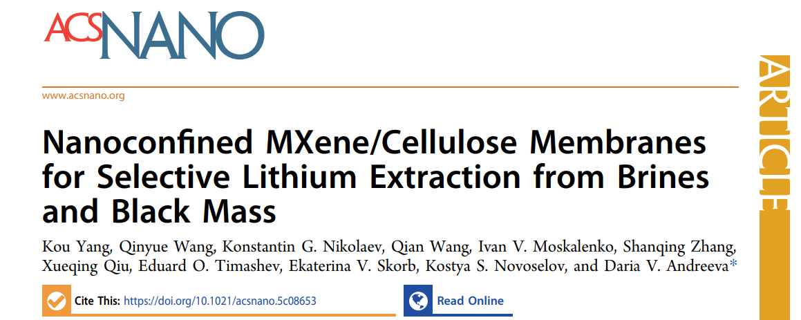 近日,我校诺奖得主联合实验室在利用二维材料从盐湖卤水与废旧锂电池中高效提取锂资源的研究中取得重大进展。相关成果以《Nanoconfined MXene/Cellulose Membranes for Selective Lithium Extraction from Brines and Black Mass》为题,发表于材料化学领域国际顶尖期刊《ACS Nano》。该论文第一作者为我校杨蔻副教授,广东工业大学为第一完成单位。诺奖得主康斯坦丁院士、我校邱学青教授与张山青教授对本研究提供了重要指导。该成果为我校诺奖得主联合实验室的持续建设与发展注入了强劲动力,并提供了坚实的科研支撑。